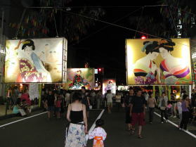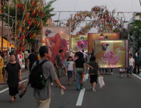日暮れ時ともなれば、これらの絵どうろうに一斉に灯がともされ、市内一円が一大不夜城と化します。その色彩と |